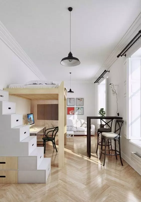 床下方的空间除了变身储物柜子,其实还可以利用床下的空间打造出一个新的房间来,比如下图,将床下的空间变成衣帽间,即便家里只有小巧的二三十平米,也能拥有自己的衣帽间呢~